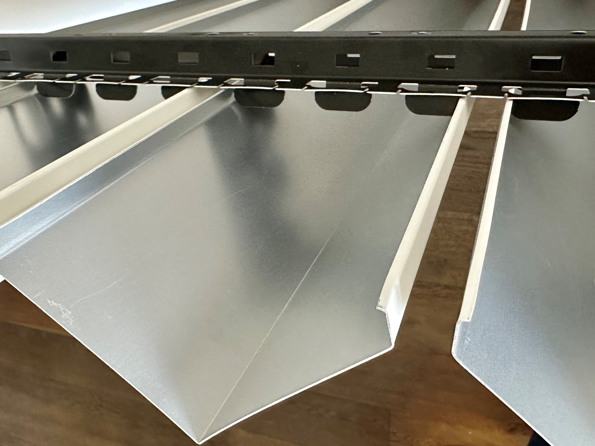 Im Unterschied zu den Standard MW-Baffles erfolgt die Befestigung auf der ORIGINAL DOBNER Universal-Tragschiene. Das Paneel wird nur eingeklemmt, ohne zu schrauben oder zu nieten. Ein Sicherungsclip ist nicht erforderlich. Die Paneelsicherung erfolgt durch einfaches Umbiegen der in der Tragschiene integrierten Sicherungs-Arretierung.